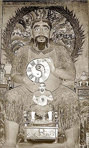 根据古书记载,伏羲仰观天文,俯观地理创作了先天八卦,成为《易经》的正式起源。图为明代建筑群的天水伏羲庙的伏羲塑像,伏羲托着绘有太极图的先天八卦。