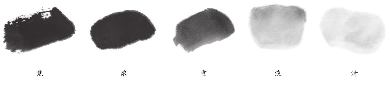 “墨分五色”更多的是讨论墨色的深浅,常常指“焦、浓、重、淡、清”。焦墨是半干的墨汁,乌黑而有光泽;浓墨是深黑的墨汁,加了水分而不显光泽;重墨含水比浓墨多,色相稍浅;淡墨的含水量较多,色相更浅;清墨只有极淡的墨迹,甚至全是水。