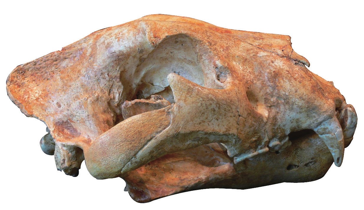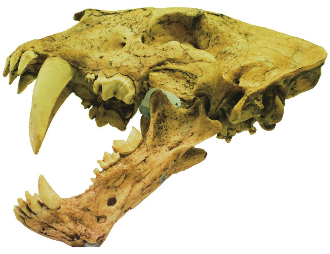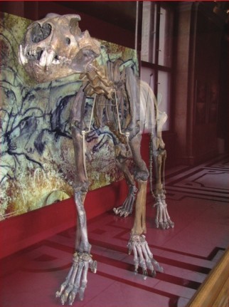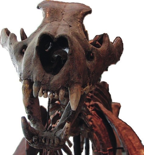 保存在博物馆中的洞狮骨架,巨大的头骨上犬齿非常明显。