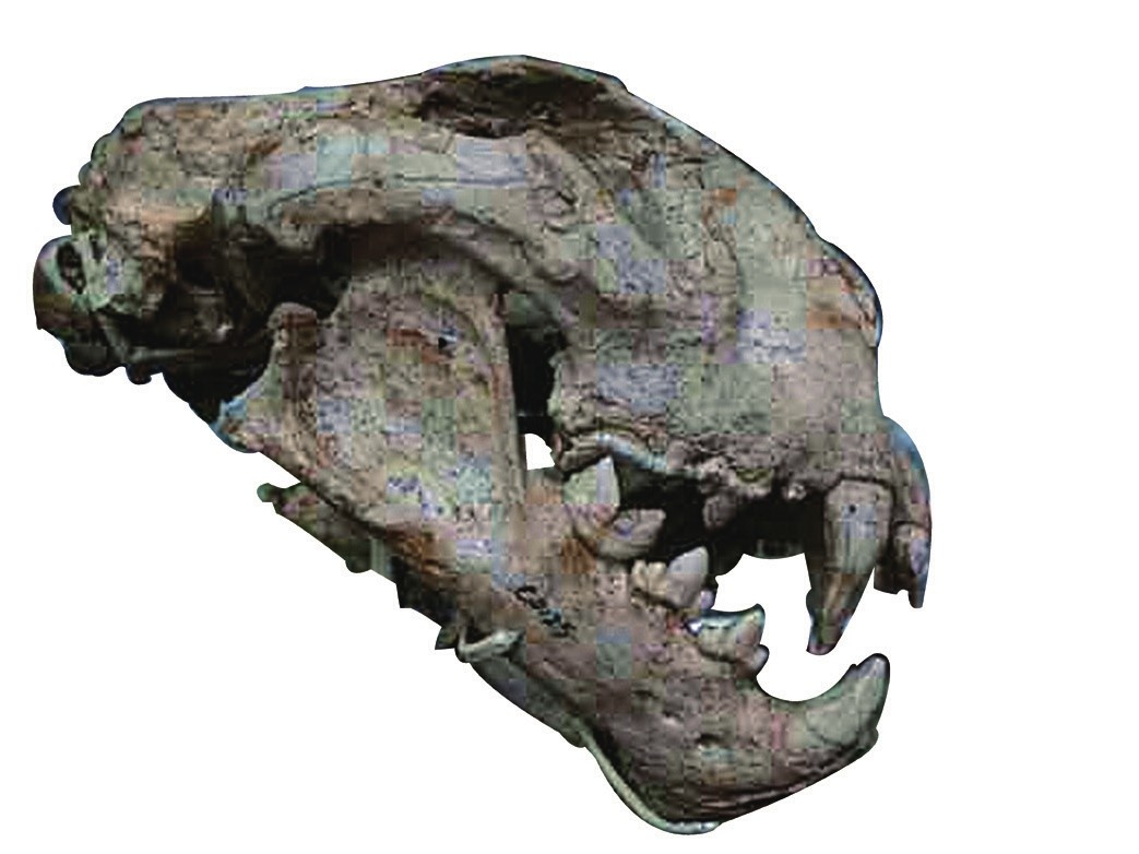 巨颏虎的上犬齿长度可达17厘米,下颌还伸出“护叶”对其进行保护,下犬齿却很小。