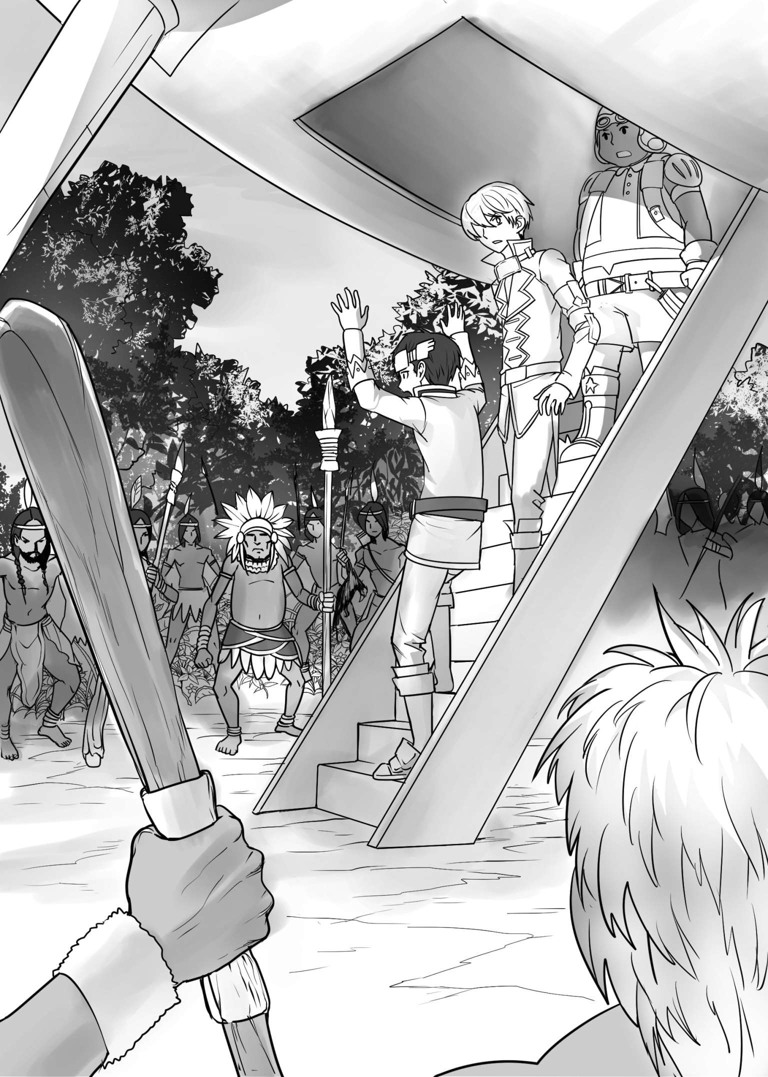 飞船外的景象令少年们震惊了——只见几十个打扮得如同原始人模样的印加星人围成一圈,将他们包围了起来。这些人身材高大,肤色黝黑,四肢赤裸,身上只披着一层藤蔓编制的藤甲,手上都拿着弓箭和长矛一类的武器。看来,他们应该就是这印加星球上的战士了。