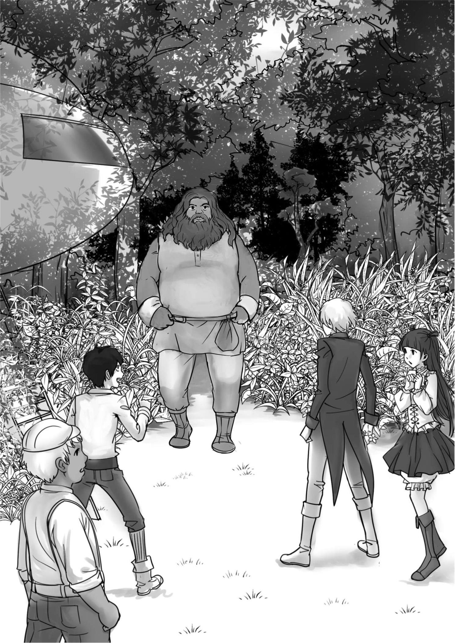 大家急忙转身,只见从密林的深处,走出了一个身材魁梧的大叔。他四肢粗壮,皮肤黝黑发亮,半长的头发披在脑后,一张脸被大胡子遮住了一半,但那双眼睛却黑白分明,闪着智慧的光芒。
