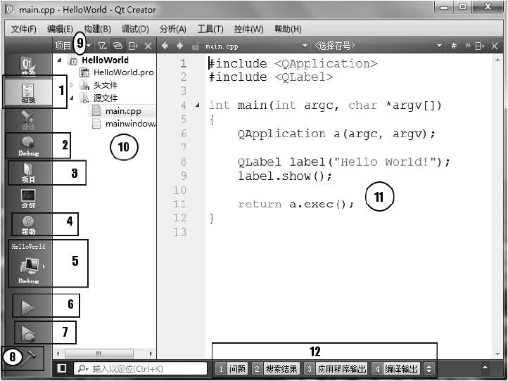 标号为6的是“运行”按钮,单击它,Qt Creator会执行编译、链接、打包等工作,直到目标程序运行起来或者出错停止。