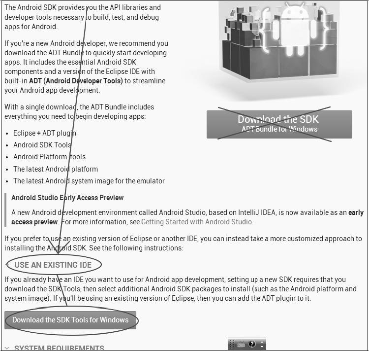 如果你想尝试下使用Java开发,可以选择ADT Bundle或Android Studio,否则就选择单独的SDK工具,参见图3-15的标注。