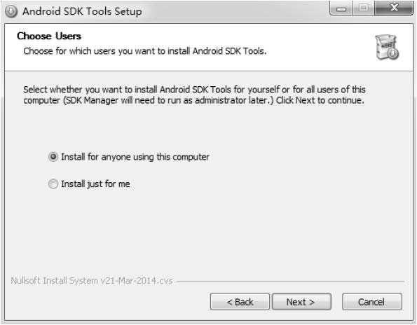 按图3-15所示,选择Download the SDK Tools for Windows。下载完成后找到可执行程序,双击之就可以开始安装SDK Tools了,如图3-16所示。