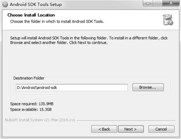 选择用户后,安装向导善意提醒我们可以改变安装路径,我改为d:\Android\android-sdk,如图3-19所示。