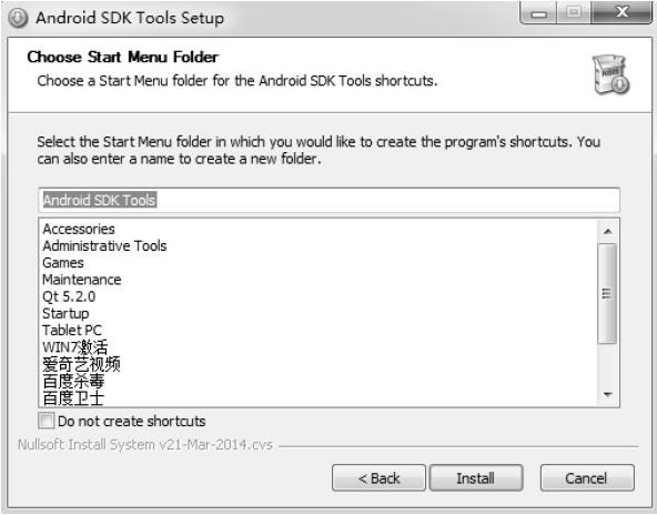 嘿,哥们儿,说你呢,继续,单击“Next”按钮。向导又让我们选择将要安装的SDK Tools在“开始”菜单中的位置,如图3-20所示。