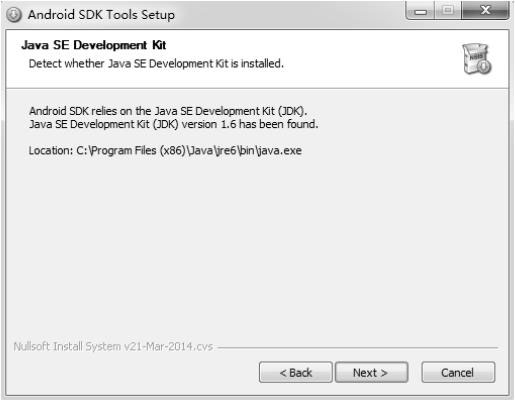 没啥可说的,请单击“Next”按钮。嗬,蛮智能的,我们刚才安装的JDK竟然被SDK Tools安装向导发现了,如图3-17所示。