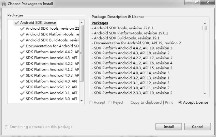 选择了要安装的SDK版本后,请单击图3-25右下角的“Install packages”按钮,这样就进入了许可协议界面,如图3-26所示。