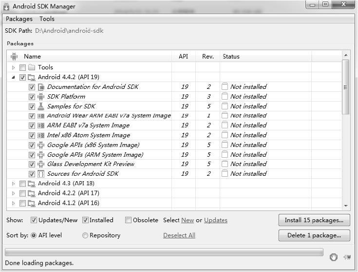 等到SDK Manager更新了在线的SDK描述信息后,把可以下载的SDK及工具都列了出来,如图3-25所示。