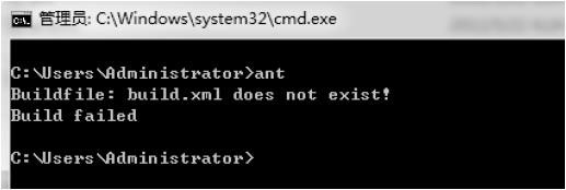 把“D:\Android\apache-ant-1.8.4\bin”目录添加到系统环境变量Path中。打开命令行窗口,输入“ant”,按回车键,之后应该看到图3-36所示界面。