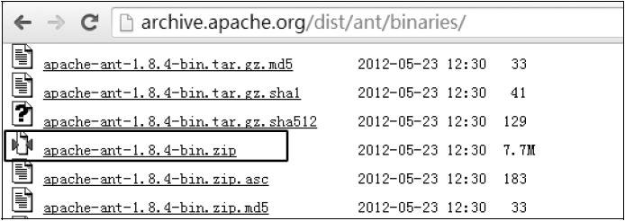 单击图3-32标注的链接,会打开页面http://archive.apache.org/dist/ant/binaries/,其中列出所有供下载的Ant包,找到1.8.4版本(如图3-33所示),单击即可下载。