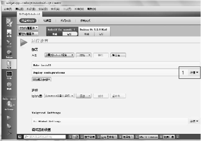 介绍完了我们的好伙伴——项目管理与代码编辑界面,接下来我们继续完成“Hello Qt on Android”的项目配置。单击图3-55中标号为2的项目标签,会看到图3-56所示的项目选项配置界面。