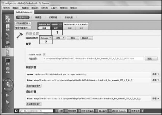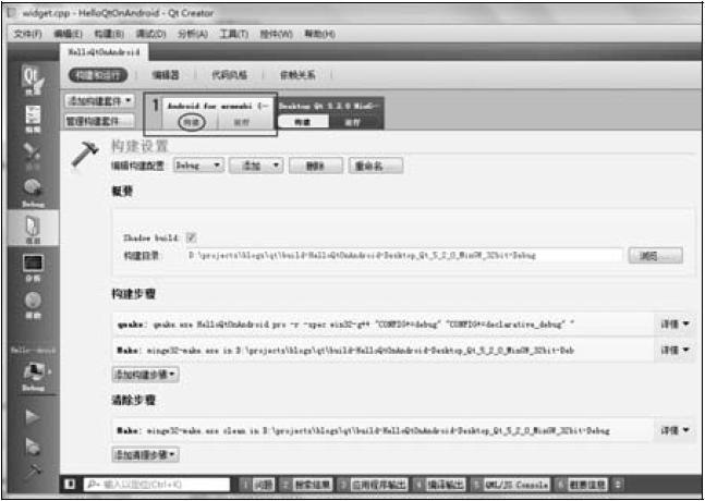 单击图3-56中标号为1的区域中的“构建”按钮,切换到“Android for armeabi”套件,进行构建相关的配置,如图3-57所示。