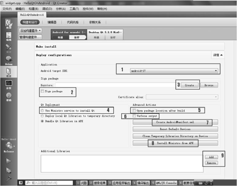 标号为8的按钮,是“Install Ministro from APK”按钮,它是Qt Creator提供给我们的一个贴心服务,允许我们把下载到本地的Ministro APK安装到Android设备上。顺便说一下,我在完成“Hello Qt on Android”项目时就遇到了无法安装Ministro服务的问题,我的XT882电信定制版手机,根本访问不到Google Play。