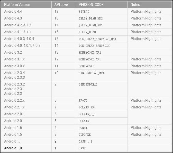 为了让大家对Android API Level有个概念,我截取了Google Android在线手册(请访问页面http://developer.android.com/guide/topics/manifest/uses-sdk-element.html)中的表格放在下面,如图3-60所示。