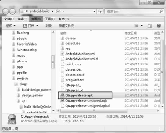 忘了吗?我们前面在运行配置中勾选了“Open package location after build”选项。如果你要在市场中发布你的应用,请注意选择(图中方框所示)签过名的版本。
