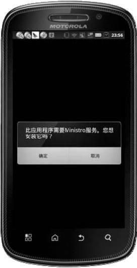 现在要操作手机,单击“确定”按钮,会尝试安装Ministro服务。惊吓来了,我看到手机屏幕上华丽地闪过一个Toast提示——“无法找到Ministro服务”,然后就是图3-73所示的情况。
