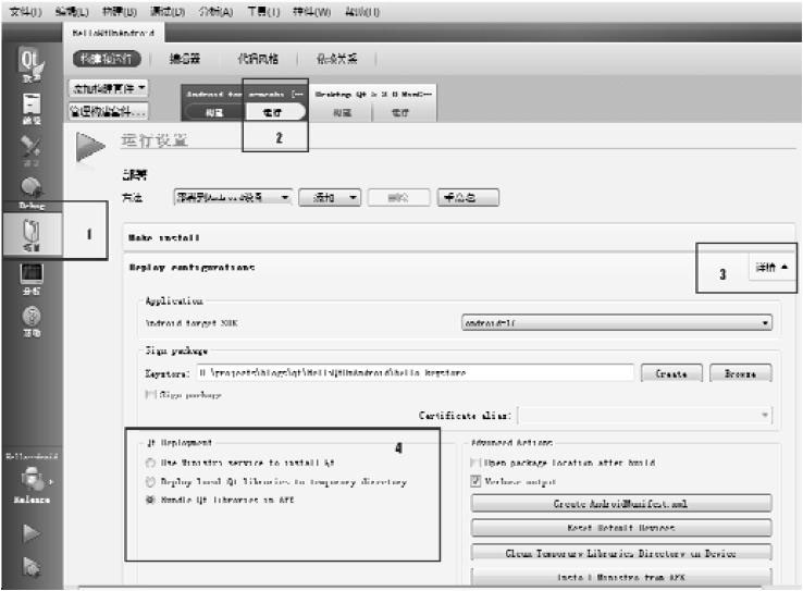 在Qt Creator中,单击左侧的“项目”标签、选择Android构建套件下的“运行”选项,再单击Depoly configurations后面的“详情”按钮(图示步骤1、2、3),即可看到三种部署策略,如图3-75中标号为4的区域所示。
