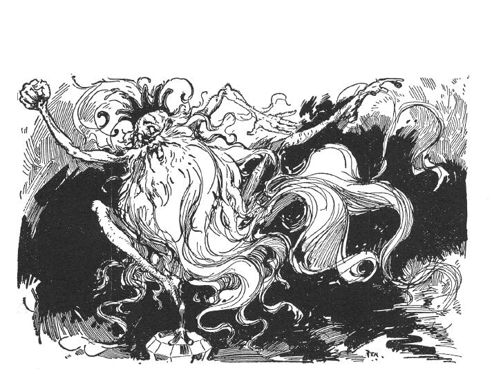 所以这会儿,只剩下火气冲天的诺姆国王独自咆哮着。他在镶满珠宝的洞穴里大踏步走来走去,每走一步他的愤怒都更添一分。然后,他突然意识到这么自顾自地生气没什么意思,得找个人来狠狠地发泄一下才行。于是,他快步走到那面专属于他的大锣前,把它敲得震天响。
