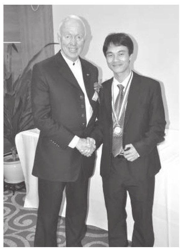 在隆重的颁奖盛典上,作为世界级的明星,许多人抢着跟托尼·博赞先生合影,当他得知我的成绩后,他却推开众人向我走来,面带微笑,强而有力地握着我的手,说道:
