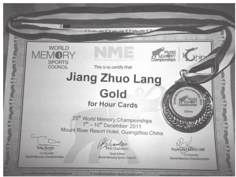 “祝贺你,蒋卓鎯先生,不可思议,世界脑力赛举办20届以来,你是我见过进步最神速的选手。这些参赛选手有的已经训练了十几年都没有比过你训练3个月。你所创造的成绩将被收录到我们的官方网站上,成为后人的典范……”
