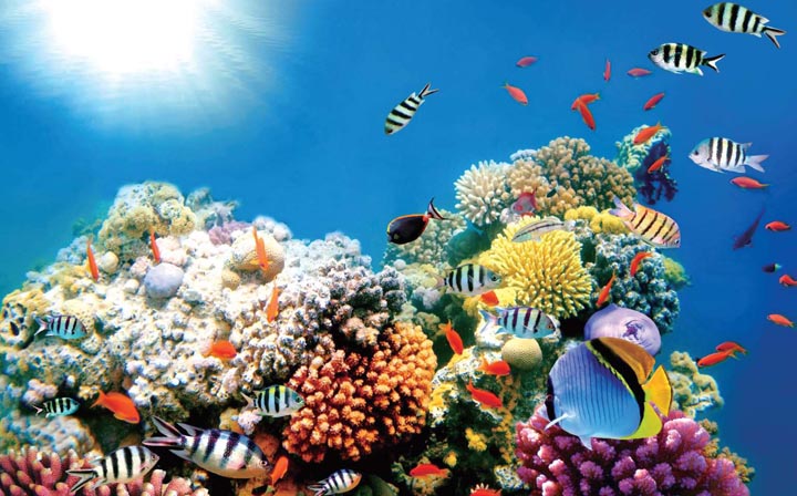 Coral reefs are very beautiful, natural structures. The various types of coral are very colourful because of natural pigments. They can be white, red, pink, purple, and many other colours. These amazing creatures are animals that act like plants. Similar to plants, they stay in one place and receive their energy from the Sun. A kind of microscopic algae lives inside of coral, providing it with food and allowing it to grow faster.