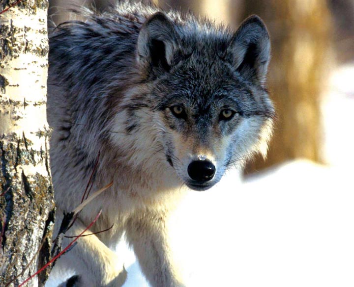 Since wolves' diet is mostly meat and bones, they have very strong jaws with 42 sharp teeth, designed for stabbing and crushing. Wolves also have excellent eyesight. Although they cannot distinguish colours, their eyes are very sensitive to movement. They can smell about 100 times better than people and can easily smell animals 2.5 kilometres away! Their sense of hearing is also remarkable — they can hear animals up to 16 kilometres away in an open space!
