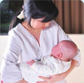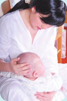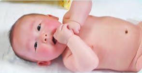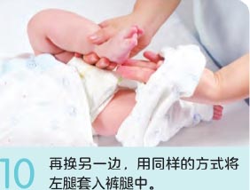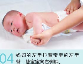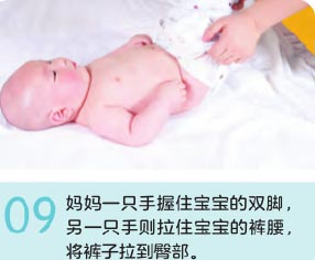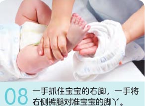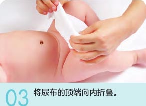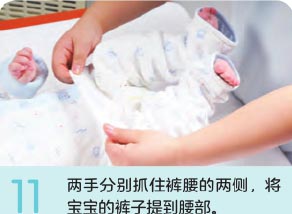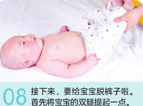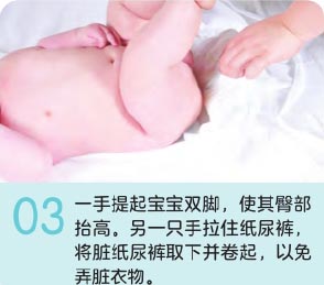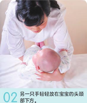(3)将宝宝倒过来,使宝宝的头顶贴在妈妈的左胸前,用左手抓住宝宝的大腿,右手用浸水的小毛巾先清洗会阴腹股沟及臀部(女宝宝一定要从前向后洗),然后清洗下肢及双脚。