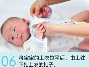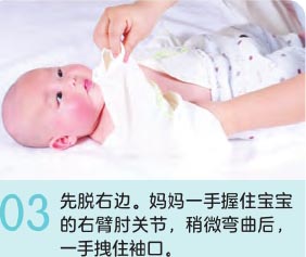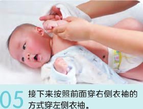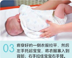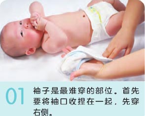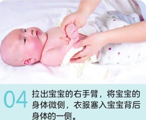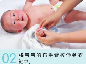 给宝宝穿衣服的时候,妈妈的动作一定要轻柔自然,以免伤害宝宝的关节。给宝宝穿衣的方法如下: