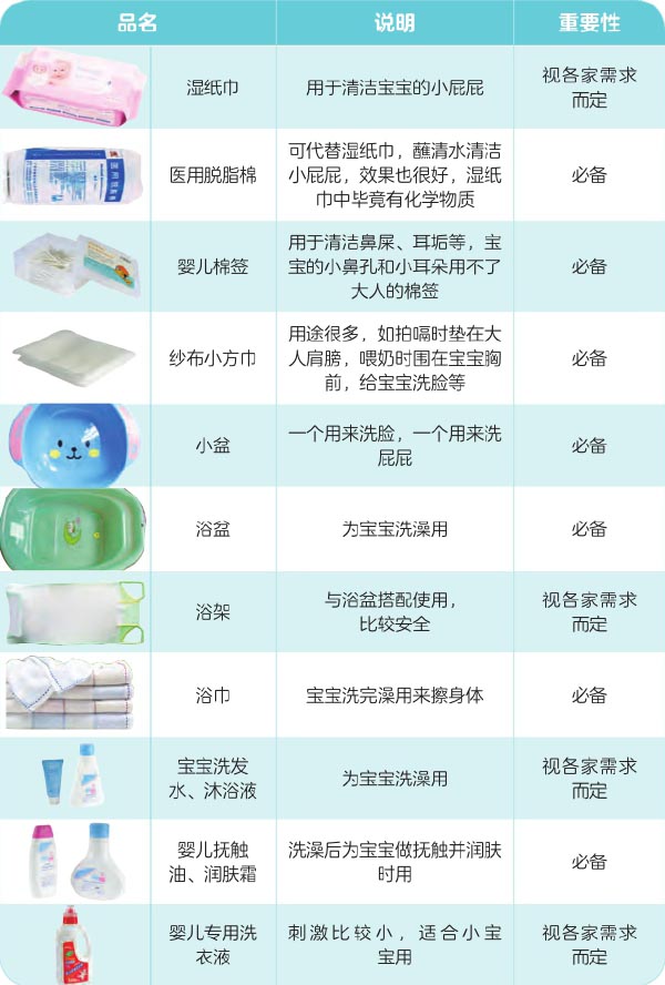 首先,准备好沐浴用品,如宝宝的衣服、浴巾、包被、纸尿裤、毛巾、澡盆等。