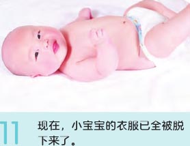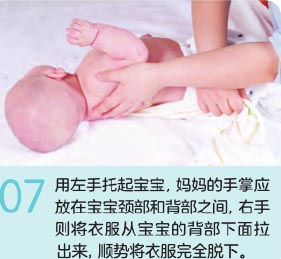 (1)脱下宝宝的衣服,让宝宝仰卧,用左手托住其枕部,拇指及中指将宝宝双耳向前按,贴于耳前脸上,这样可以防止宝宝耳内灌水。