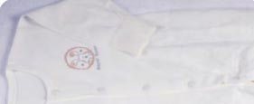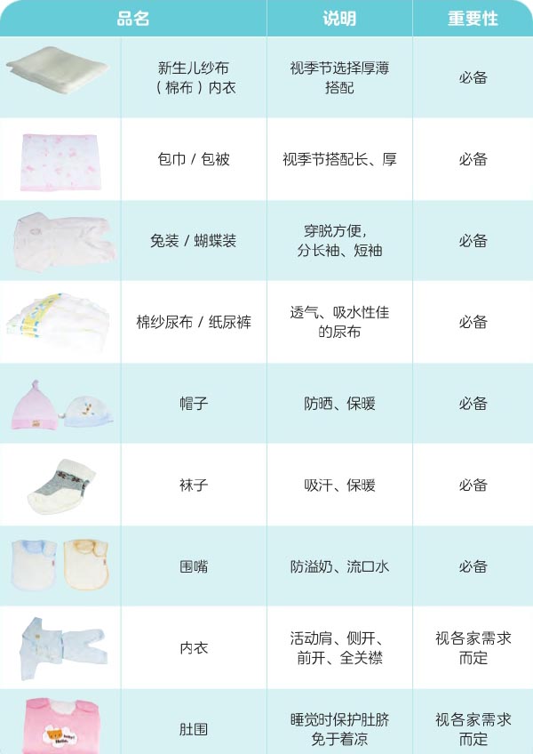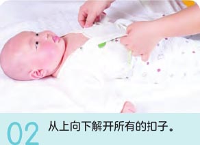 因新生儿的颈部较短,可选择无领或和尚领斜襟开衫,这样的衣服不用系扣子,只用带子在身体的一侧打结,不仅容易穿脱,并可随着新生儿逐渐长大而随意放松,一件衣服可穿较长的时间。