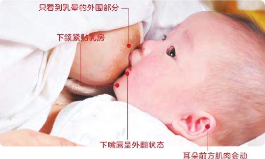 只看到乳晕的外围部分:宝宝吮吸时,应该含住了乳晕的大部分,从你的视野看去,只能看到乳晕的外围部分。