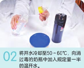 ☆等水稍凉后,用消毒过的奶瓶夹夹取出所有用具,待沥干之后将奶嘴、瓶套套回奶瓶上备用。