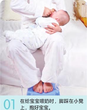 在椅子上哺乳时,可以在椅子前面放一个矮脚凳,这样妈妈可以双脚踩在上面以抬高腿部;当坐在床上哺乳时,可以在背后多放几个枕头,帮助妈妈坐直。此外,还可以在膝盖下、腿上和抱宝宝的胳膊下也各放一个枕头。