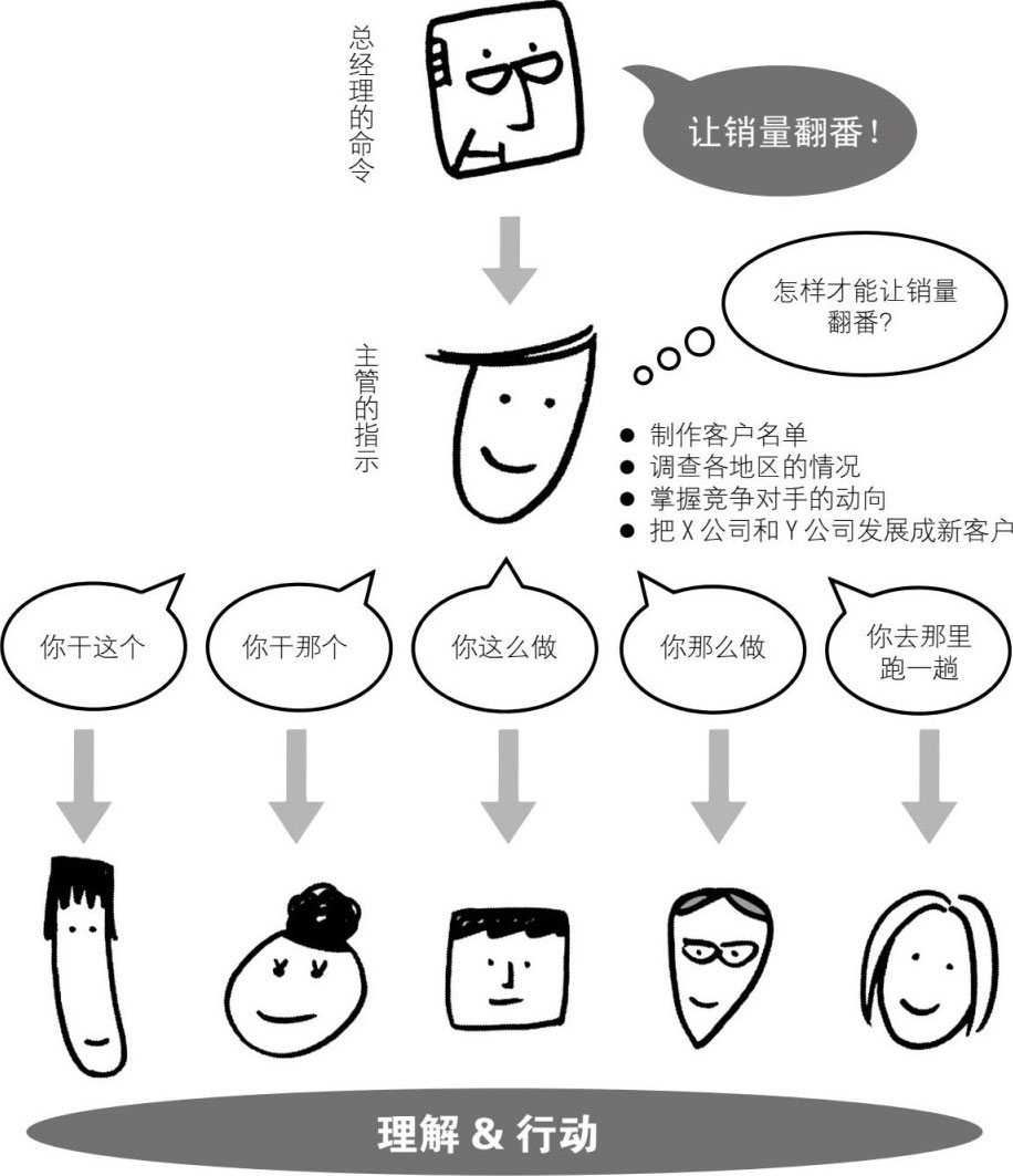 如果手下有优秀的人才,也可以让他来设计实现销量翻番的方案,但是如果让所有下属都来“考虑销量翻番的方案”,那就等于主管又变回了单纯的传话筒。