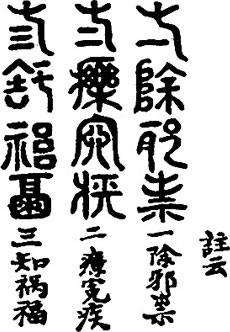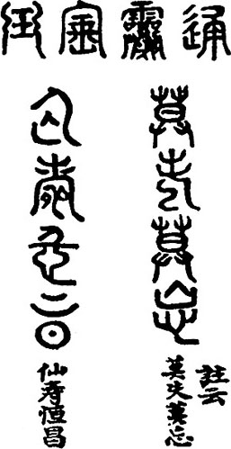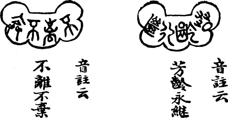 那顽石亦曾记下他这幻相并癞僧所镌的篆文,今亦按图画于后。但其真体最小,方能从胎中小儿口中衔下。今若按其体画,恐字迹过于微细,使观者大费眼光,亦非畅事。故今只按其形式,无非略展放些规矩,使观者便于灯下醉中可阅。今注明此故,方无“胎中之儿口有多大,怎得衔此狼犺