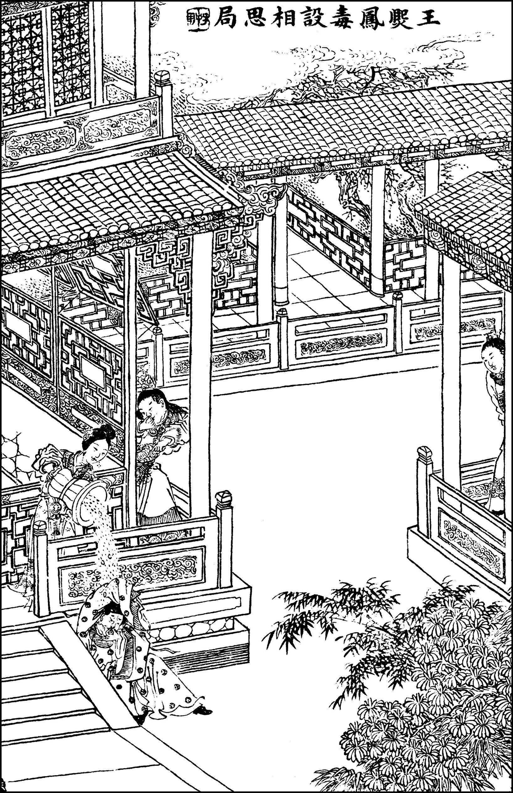 话说凤姐正与平儿说话,只见有人回说:“瑞大爷来了。”凤姐急命快请进来。贾瑞见往里让,心中喜出望外,急忙进来,见了凤姐,满面陪笑,连连问好。凤姐也假意殷勤,让茶让坐。贾瑞见凤姐如此打扮,一发酥倒,因饧了眼问道:“二哥哥怎么还不回来?”凤姐道:“不知什么原故。”贾瑞笑道:“别是在路上有人绊住了脚,舍不得回来也未可知。”凤姐道:“也未可知。男人家见一个爱一个,也是有的。”贾瑞笑道:“嫂子这话说错了,我就不这样。”凤姐笑道:“像你这样的人,能有几个呢。十个里也挑不出一个来。”贾瑞听了,喜的抓耳挠腮,又道:“嫂子天天也闷的很!”凤姐道:“正是呢,只盼个人来说话,解解闷儿。”贾瑞笑道:“我倒天天闲着,天天过来替嫂子解解闲闷,可好不好?”凤姐笑道:“你哄我呢。你那里肯往我这里来。”贾瑞道:“我在嫂子跟前若有一点谎话,天打雷劈。只因素日闻得人说嫂子是个利害人,在你跟前一点也错不得,所以吓住了。我如今见嫂子最是个有说有笑,极疼人的。我怎么不来,死了我也愿意!”凤姐笑道:“果然你是个明白人,比贾蓉两个强远了。我看他那样清秀,只当他们心里明白,谁知竟是两个糊涂虫,一点不知人心。”贾瑞听了这话,越发撞在心坎儿上,由不得又往前凑了一凑,觑着眼看凤姐带的荷包,然后又问戴着什么戒指。凤姐悄悄道:“放尊重着,别叫丫头们看了笑话。”贾瑞如听纶音佛语一般,忙往后退。凤姐笑道:“你该去了。”贾瑞道:“我再坐一坐儿。好狠心的嫂子!”凤姐又悄悄的道:“大天白日,人来人往,你就在这里也不方便。你且去等着,晚上起了更你来,悄悄的在西边穿堂儿等我。”贾瑞听了,如得珍宝,忙问道:“你别哄我。但只那里人过的多,怎么好躲的?”凤姐道:“你只放心。我把上夜的小厮们都放了假,两边门一关,再没别人了。”贾瑞听了,喜之不尽,忙忙的告辞而去,心内以为得手。盼到晚上,果然黑地里摸入荣府,趁掩门时钻入穿堂,果见漆黑无一人,往贾母那边去的门户已倒锁,只有向东的门未关。贾瑞侧耳听着,半日不见人来,忽听咯噔一声,东边的门也倒关了。贾瑞急的也不敢则声,只得悄悄出来,将门撼了撼,关的铁桶一般。此时要求出去亦不能够,南北皆是大房墙,要跳亦无攀援。这屋内又是过门风,空落落。现是腊月天气,夜又长,朔风凛凛,侵肌裂骨,一夜几乎不曾冻死。好容易盼到早晨,只见一个老婆子先将东门开了,进来去叫西门。贾瑞瞅的背着脸,一溜烟抱着肩跑了出来。幸而天色尚早,人都未起,从后门一径跑回家去。原来贾瑞父母早亡,只有他祖父代儒教养。那代儒素日教训最严,不许贾瑞多走一步,生怕他在外吃酒赌钱,有误学业。今忽见他一夜不归,只料定他在外非饮即赌,嫖娼宿妓,那里想到这段公案,因此气了一夜。贾瑞也捻着一把汗,少不得回来撒谎,只说:“往舅舅家去了,天黑了,留我住了一夜。”代儒道:“自来出门,非禀我不敢擅出,如何昨日私自去了?据此亦该打,何况是撒谎。”因此发狠,到底打了三四十板,还不许吃饭,令他跪在院内读文章,定要补出十天的功课来方罢。贾瑞直冻了一夜,今又遭了苦打,且饿着肚子,跪在风地里读文章,其苦万状。