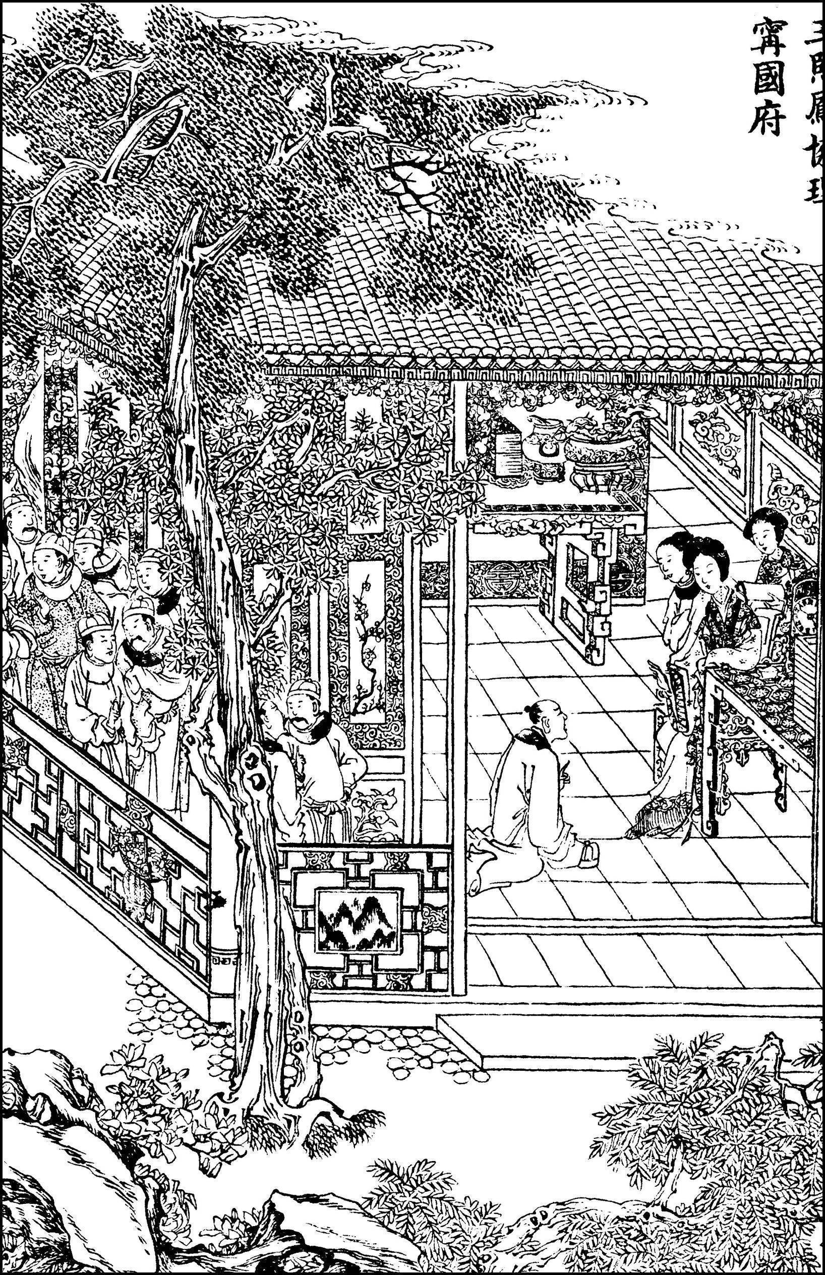 对面高起着宣坛,僧道对坛榜文。榜上大书:“世袭宁国公冢孙妇,防护内廷御前侍卫龙禁尉,贾门秦氏宜人之丧。四大部州至中之地,奉天承运太平之国,总理虚无寂静教门僧录司正堂万虚、总理元始三一教门道录司正堂叶生等,敬谨修斋,朝天叩佛”,以及“恭请诸伽蓝揭谛功曹等神,圣恩普锡,神威远镇,四十九日消灾洗孽平安水陆道场”等语,亦不消烦记。