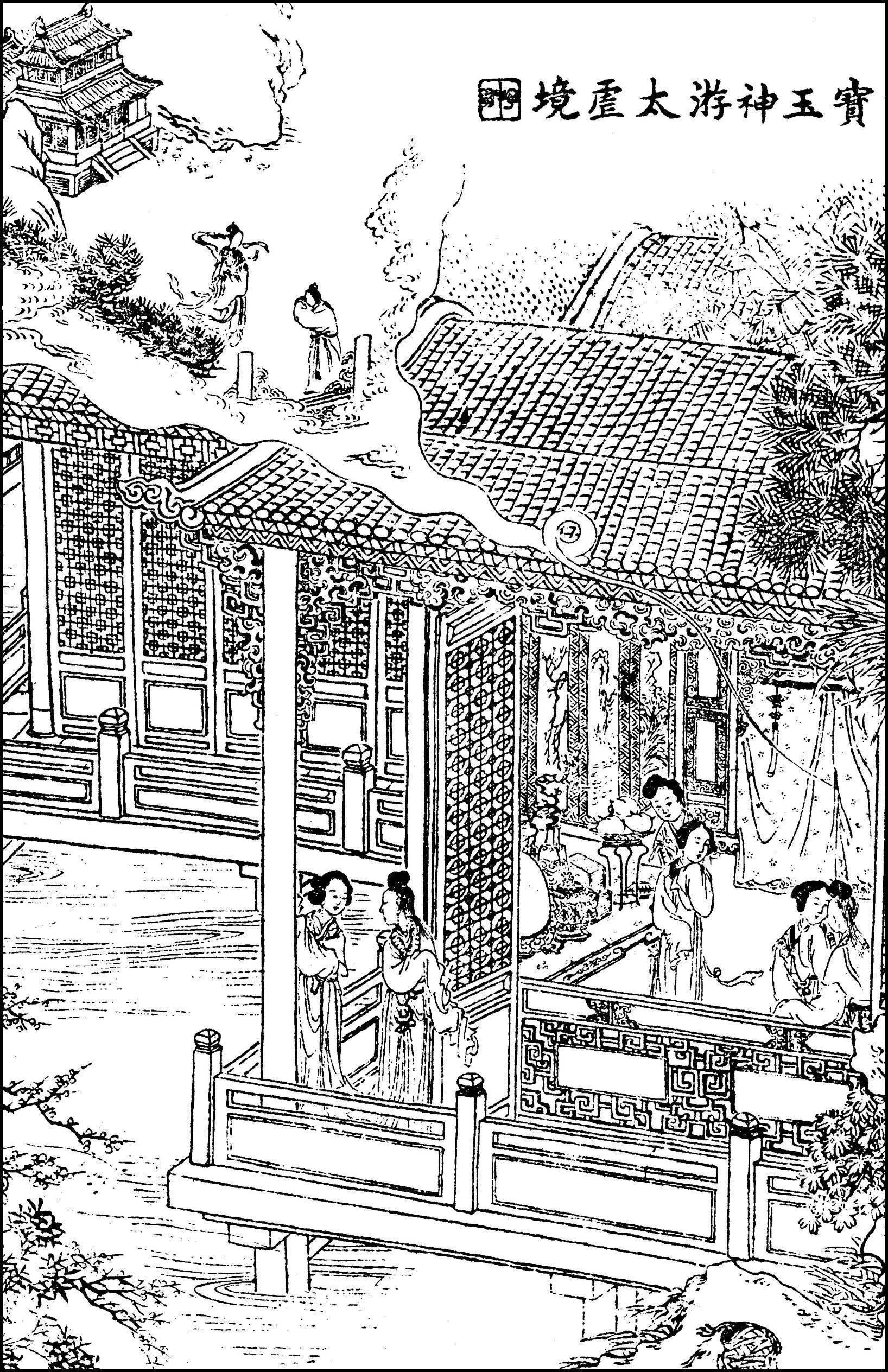 宝玉见是一个仙姑,喜的忙来作揖,笑问道:“神仙姐姐,不知从那里来,如今要往那里去?我也不知这是何处,望乞携带携带。”那仙姑笑道:“吾居离恨天之上,灌愁海之中,乃放春山遣香洞太虚幻境警幻仙姑是也,司人间之风情月债,掌尘世之女怨男痴。因近来风流冤孽,缠绵于此处,是以前来访察机会,布散相思。今忽与尔相逢,亦非偶然。此离吾境不远,别无他物,仅有自采仙茗一盏,亲酿美酒一瓮,素练魔舞歌姬数人,新填红楼梦仙曲十二支。试随吾一游否?”宝玉听了,喜跃非常,便忘了秦氏在何处,竟随了仙姑至一所在。有石牌坊横建,上书“太虚幻境”四个大字,两边一副对联,乃是: