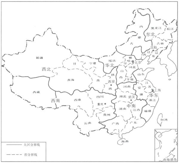 (注:1952年末,察哈尔划入内蒙古、山西和河北;平原划入河南和山东。1954年撤销大行政区时,松江并入黑龙江,辽东和辽西合并成辽宁,绥远并入内蒙古,宁夏成为甘肃的一部分。1955年,西康划入四川和西藏,热河划入内蒙古、辽宁和河北。1958年,宁夏重新出现,成为宁夏回族自治区。)