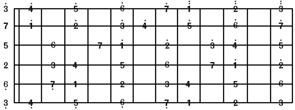吉他上的各个音在吉他指板上的位置叫作音位,下图就是古典吉他的音位图。
