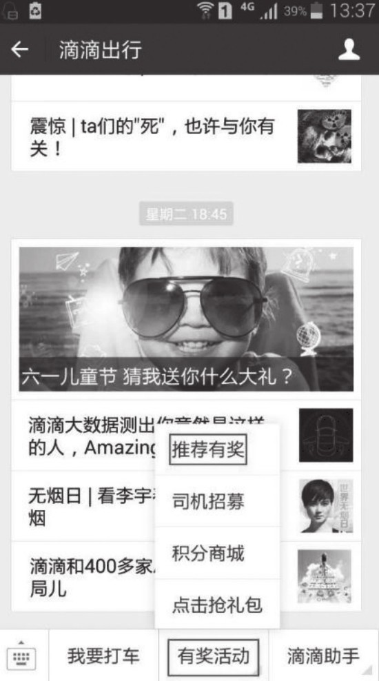 这一设置非常有吸引力,大大提高了粉丝黏性,通过一系列促销、有奖活动等多种福利方式,深深赢得了微信用户们的喜爱,同时也为滴滴打车带来了更多的新用户。