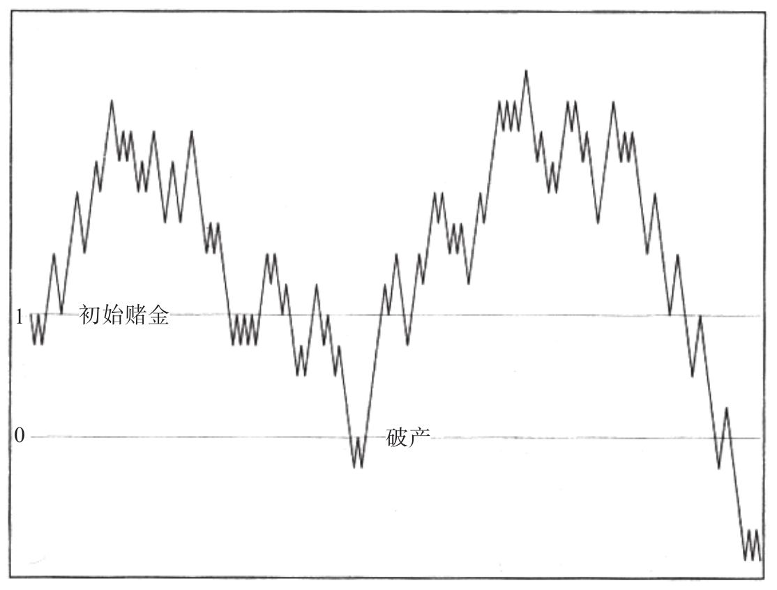 期望值只是一项统计学虚构数据,就像一家有2.5个孩子一样,是不符合实际情况的。一个赌徒的实际资金与此大相径庭。图1-1中锯齿状线显示出一个典型赌徒的资金走向,此图是在假设赌徒每次押注的金额相等的情况下简单模拟绘制而成的。锯齿状线的摆动毫无逻辑,数学家们将其称作“随机游走”。