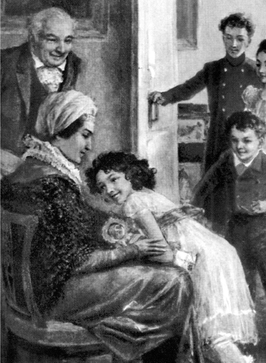 这是个黑眼睛、大嘴巴、并不漂亮却生气勃勃的女孩,她那稚嫩的双肩裸露着,这是由于跑得太快上衣滑下来的缘故,卷曲的黑发偏到了后面,袒露着两条纤细的胳膊,下身是一条镶花边的女式齐膝短裤,小小的脚上穿着一双敞口小皮鞋,她正处于那样一种美好动人的年华,已经不是孩子了,而这个女孩还不是大姑娘。她挣脱父亲,向母亲跑去,毫不理会她的责备,把通红的脸蛋藏在母亲的花边披肩里,咯咯地笑了起来。她不知在笑什么,上气不接下气地讲着她从裙子下面拿出的布娃娃。