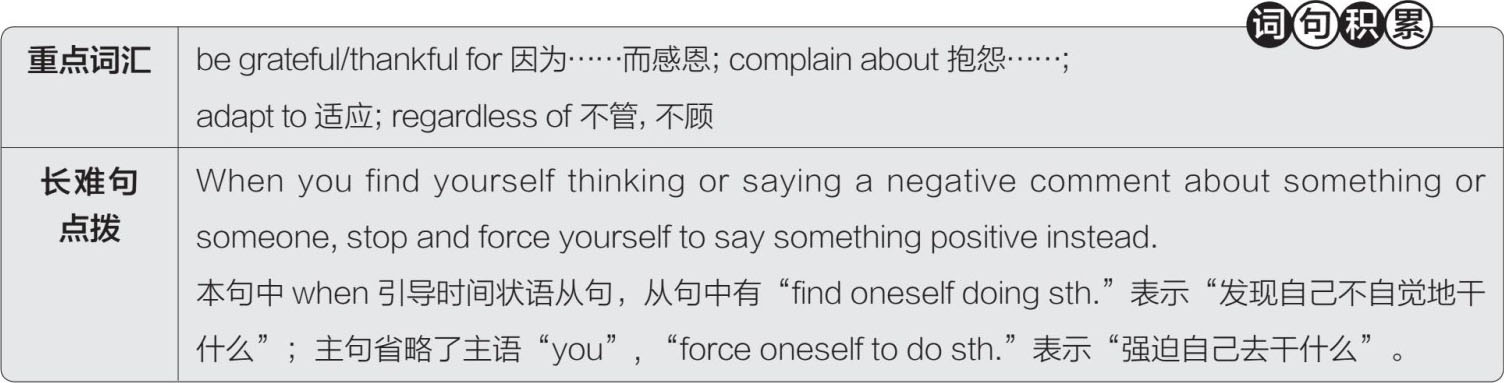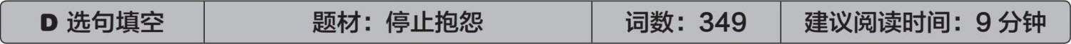 过渡句有两种,一种是段落内部的过渡句;另一种是段落之间的过渡句。解题时,要“瞻前顾后”找提示,即阅读上一句或上一段的结尾部分,通常正确答案与上一句或上一段的结尾衔接紧密,同时要结合下一句或下一段的内容,看所选的答案是否能将两部分内容有机连接起来。如在选择D篇文章的第一空句时,根据上文叙述“最幸福的人都会抱怨,可是抱怨是无用的”,而下文要讲述“停止抱怨的建议”,所以判断起承上启下作用的句子只有F项。