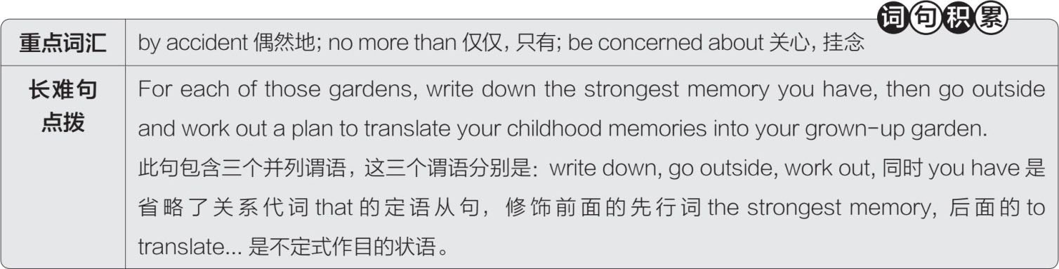 Our model of what a garden should be often goes back to childhood. Grandma's rose garden and Dad's vegetable garden might be good or bad, but that's not what's important. 4 —how being in those gardens made us feel. If you’d like to build a powerful bond with your garden, start by taking some time to recall the gardens of your youth. 5 , then go outside and work out a plan to translate your childhood memories into your grown-up garden. Have fun. (2016全国卷II)