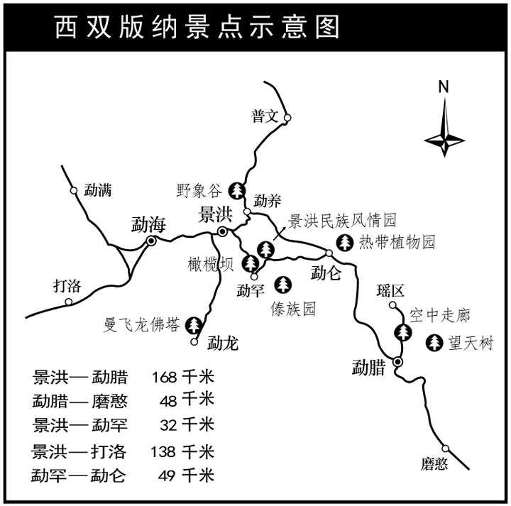 东线:景洪→橄榄坝(勐罕镇)→勐仑热带植物园(葫芦岛)→望天树(勐腊)