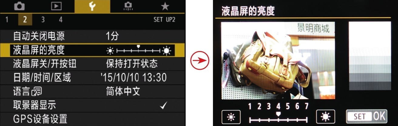在环境光线较暗的地方拍摄时,为了方便查看,还可以将液晶屏的显示亮度调得低一些,不仅能够保证清晰地显示照片,还能够节省电量。